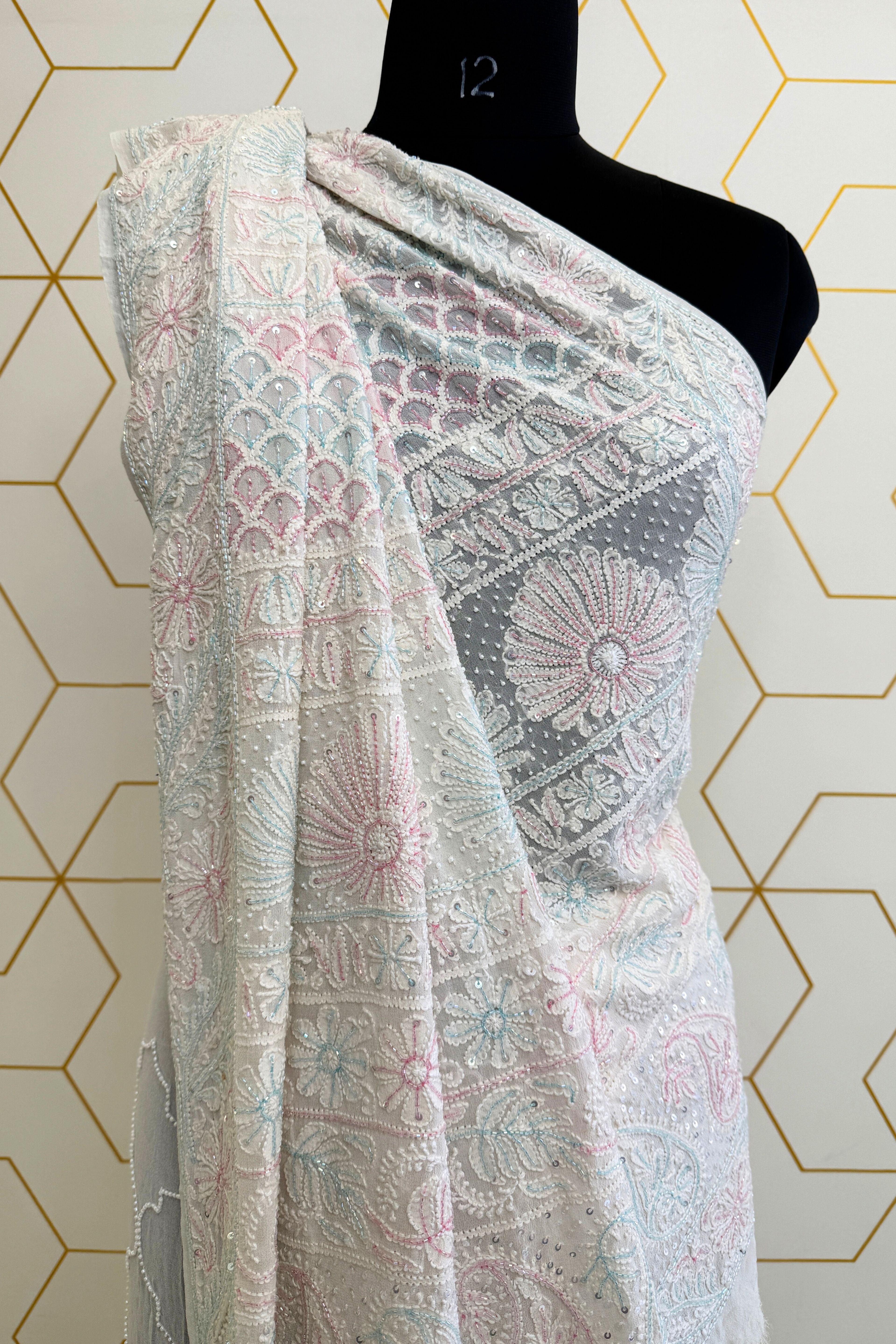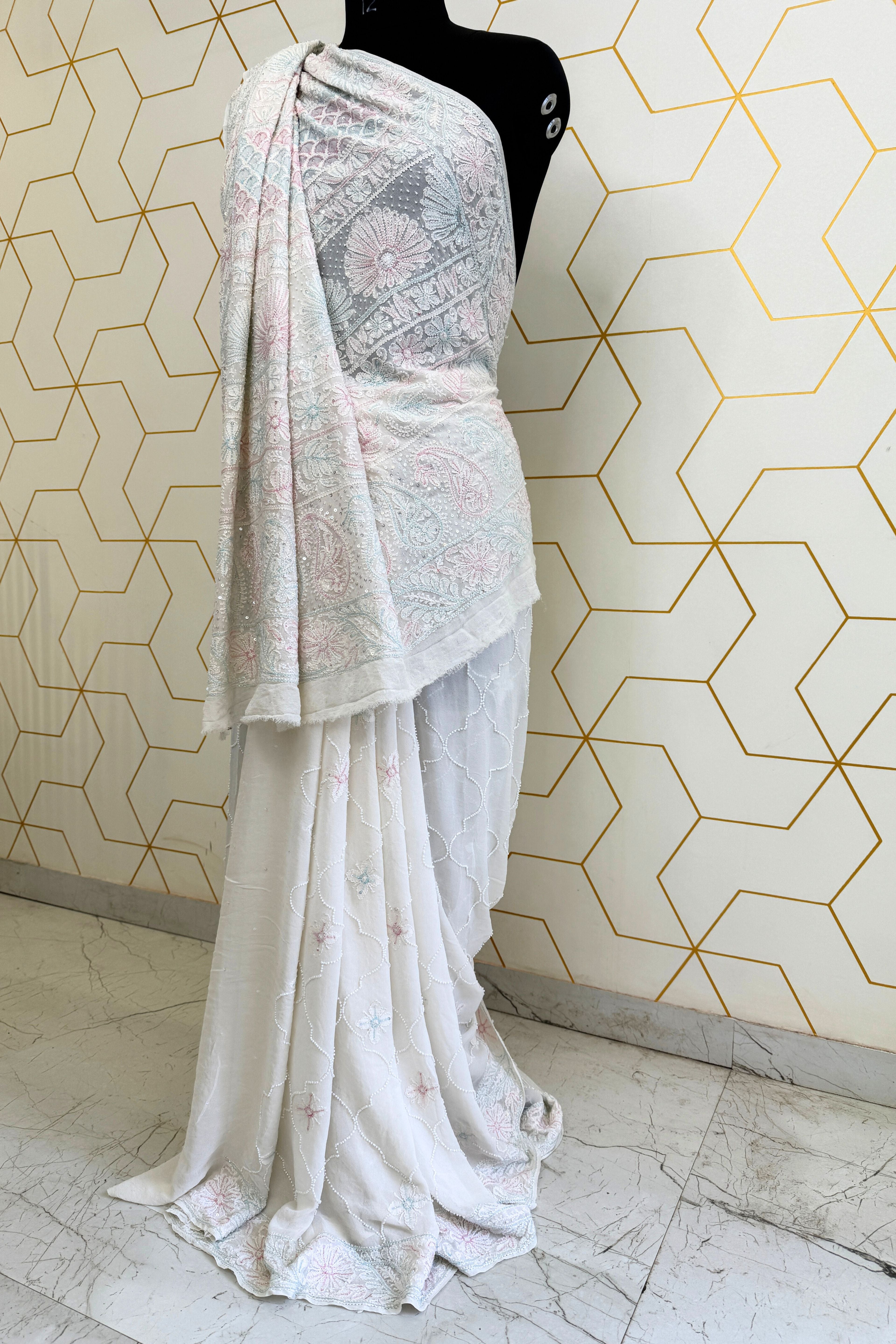 Elevate your elegance with this exquisite Georgette Chikankari saree, a masterpiece of craftsmanship that seamlessly blends tradition with contemporary charm. Adorned with intricate multi-colour cut dana work, each shimmering detail adds a touch of opulence, while the delicate pearl embellishments enhance its regal allure. The Dyeable lightweight georgette fabric drapes beautifully, offering effortless grace and movement. Perfect for festive occasions, weddings, and grand celebrations. Style it with statement jewelry and a classic blouse to complete your majestic look.