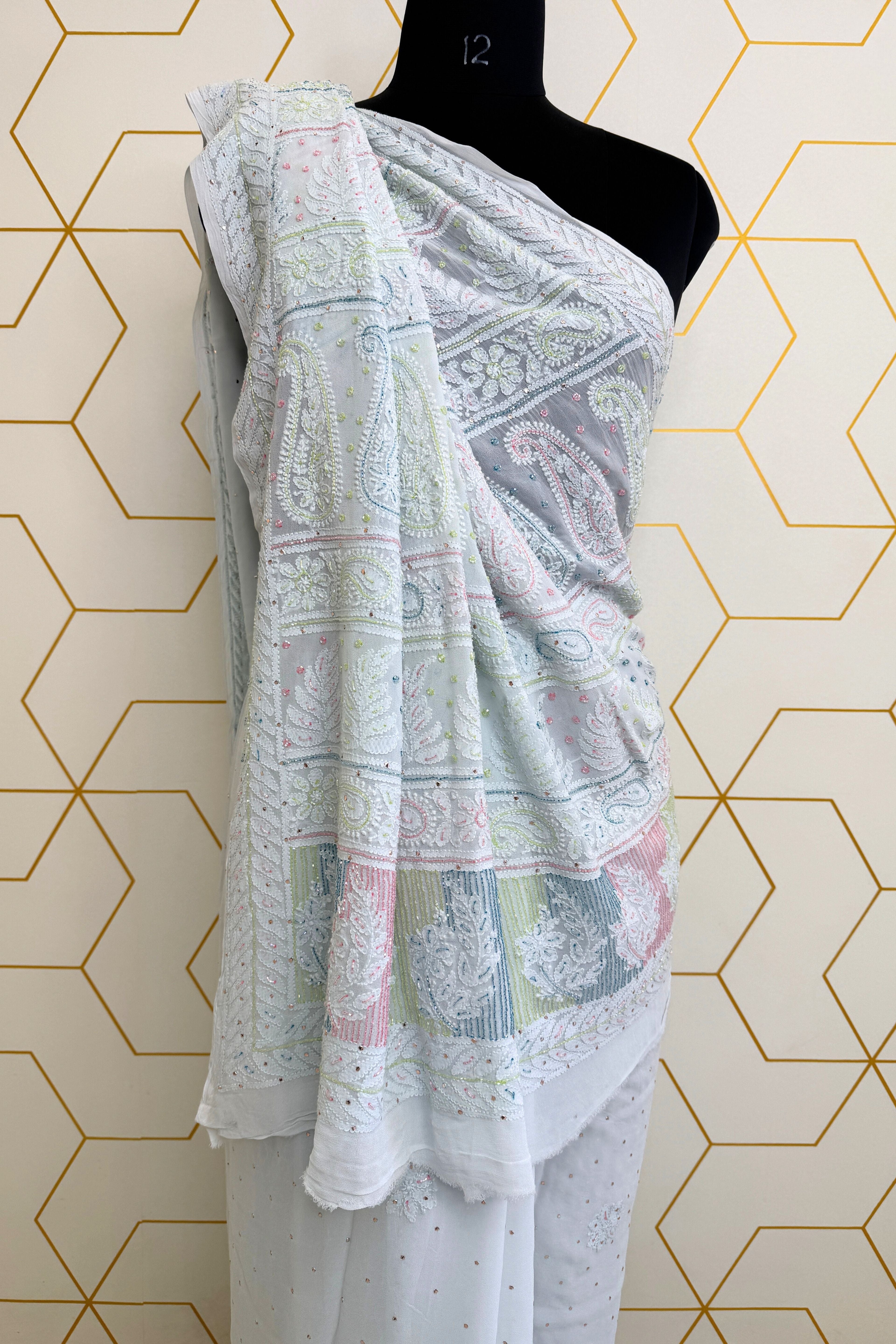 Grace meets tradition in this exquisite Georgette Chikankari saree, meticulously handcrafted to showcase the timeless beauty of Lucknowi embroidery. The soft, flowing georgette fabric drapes effortlessly, offering a lightweight and elegant feel, perfect for both festive occasions and sophisticated gatherings.