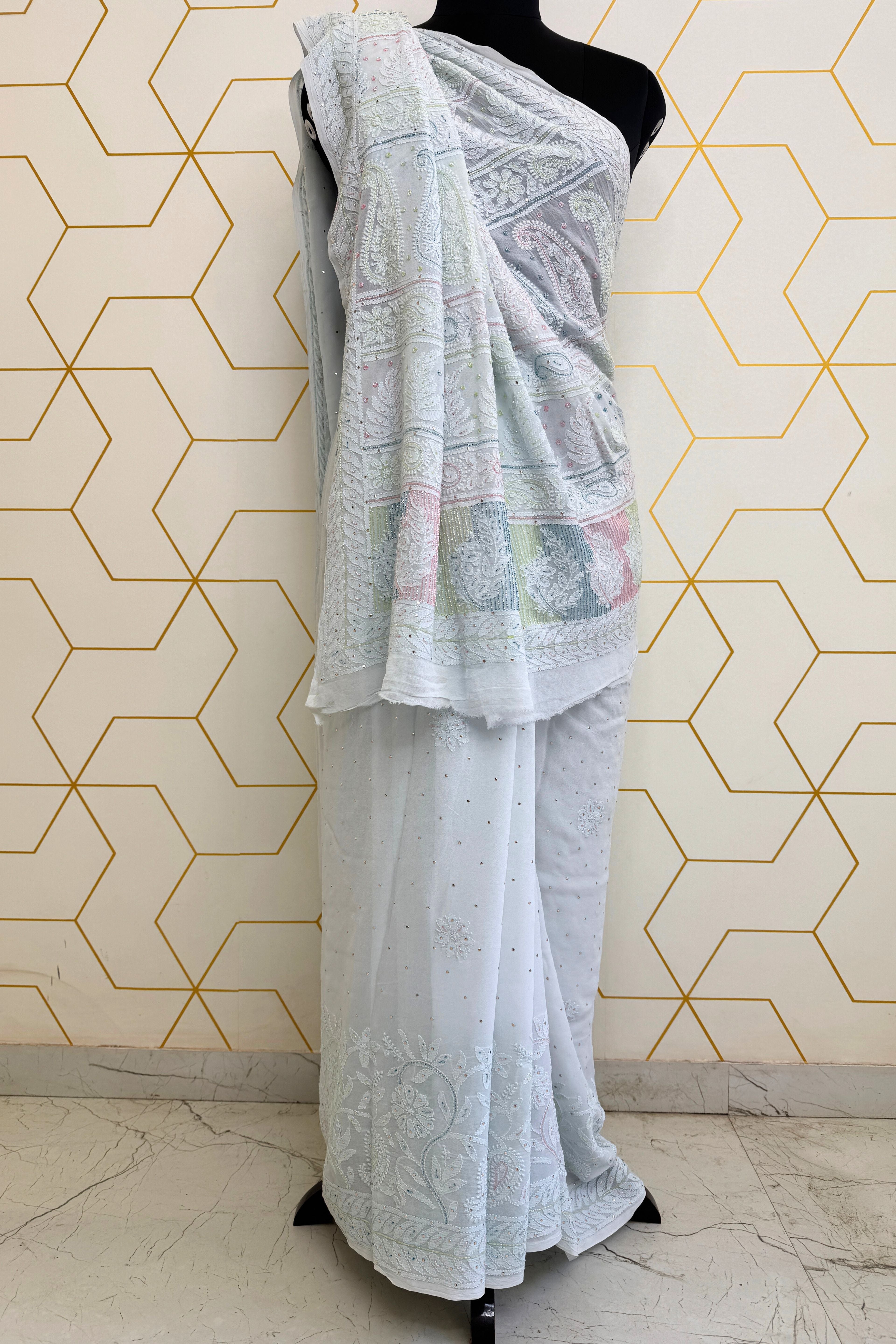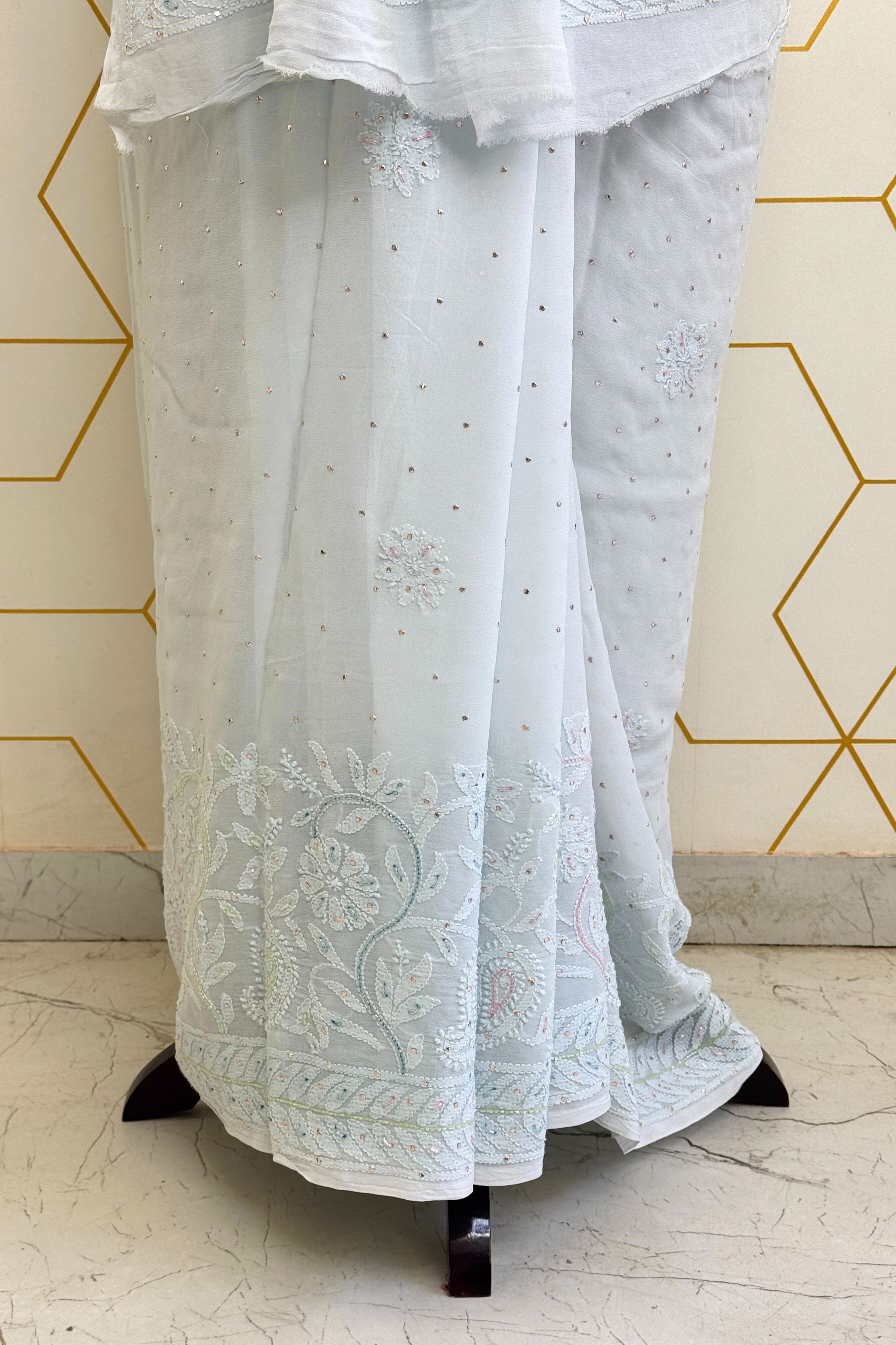 Delicate pearl work adds a subtle shimmer, enhancing the intricate floral and paisley patterns of the Chikankari embroidery. Complementing this is Cut-Dana work, which lends a refined sparkle, ensuring the saree radiates understated glamour.