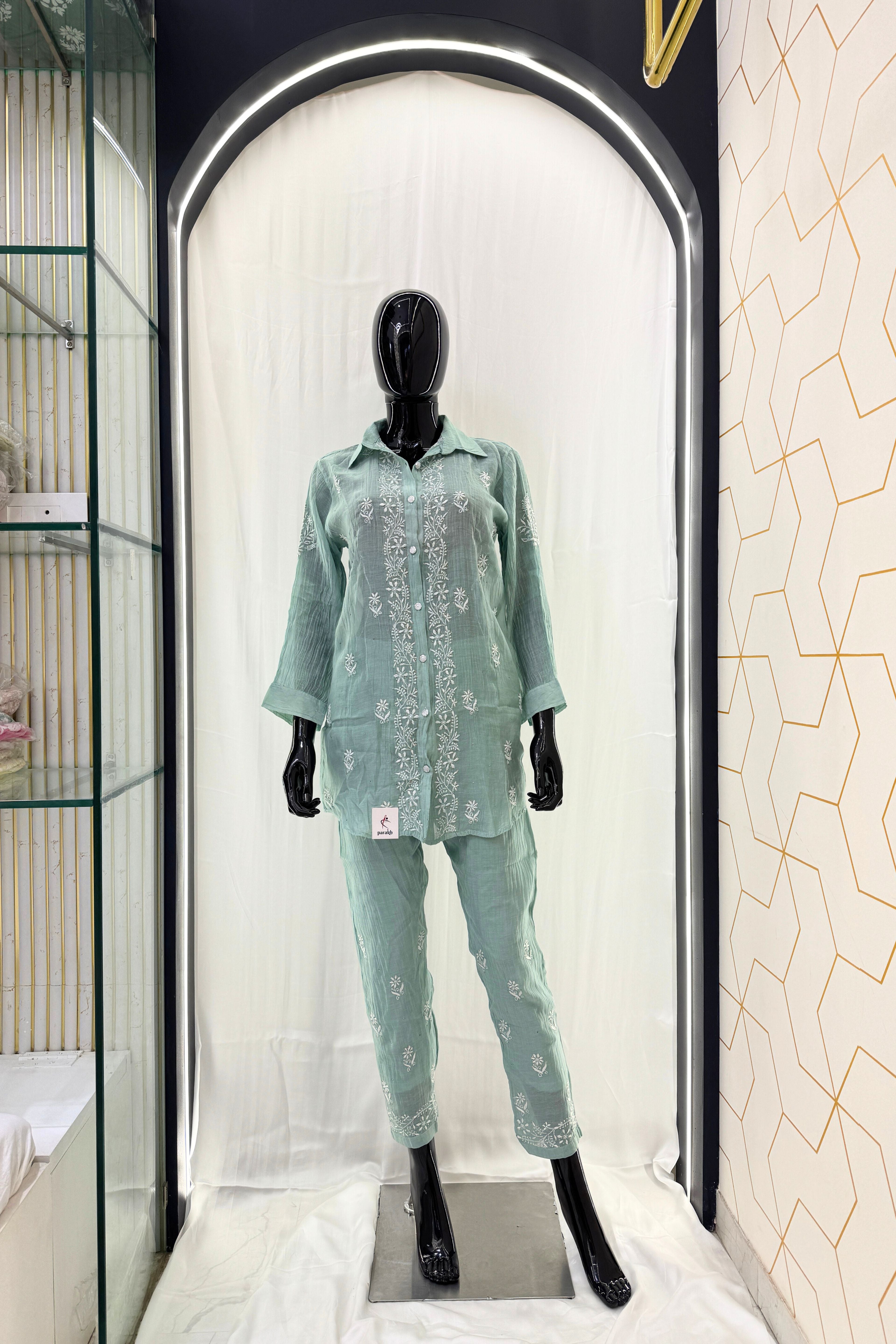 Indulge in the timeless beauty of hand-embroidered craftsmanship with this exquisite Mal Chanderi Chikankari Co-Ord Set. The lightweight, breathable mal fabric drapes gracefully, offering a luxurious yet comfortable fit. Meticulously handcrafted with intricate Chikankari embroidery, each stitch tells a story of heritage and artistry.