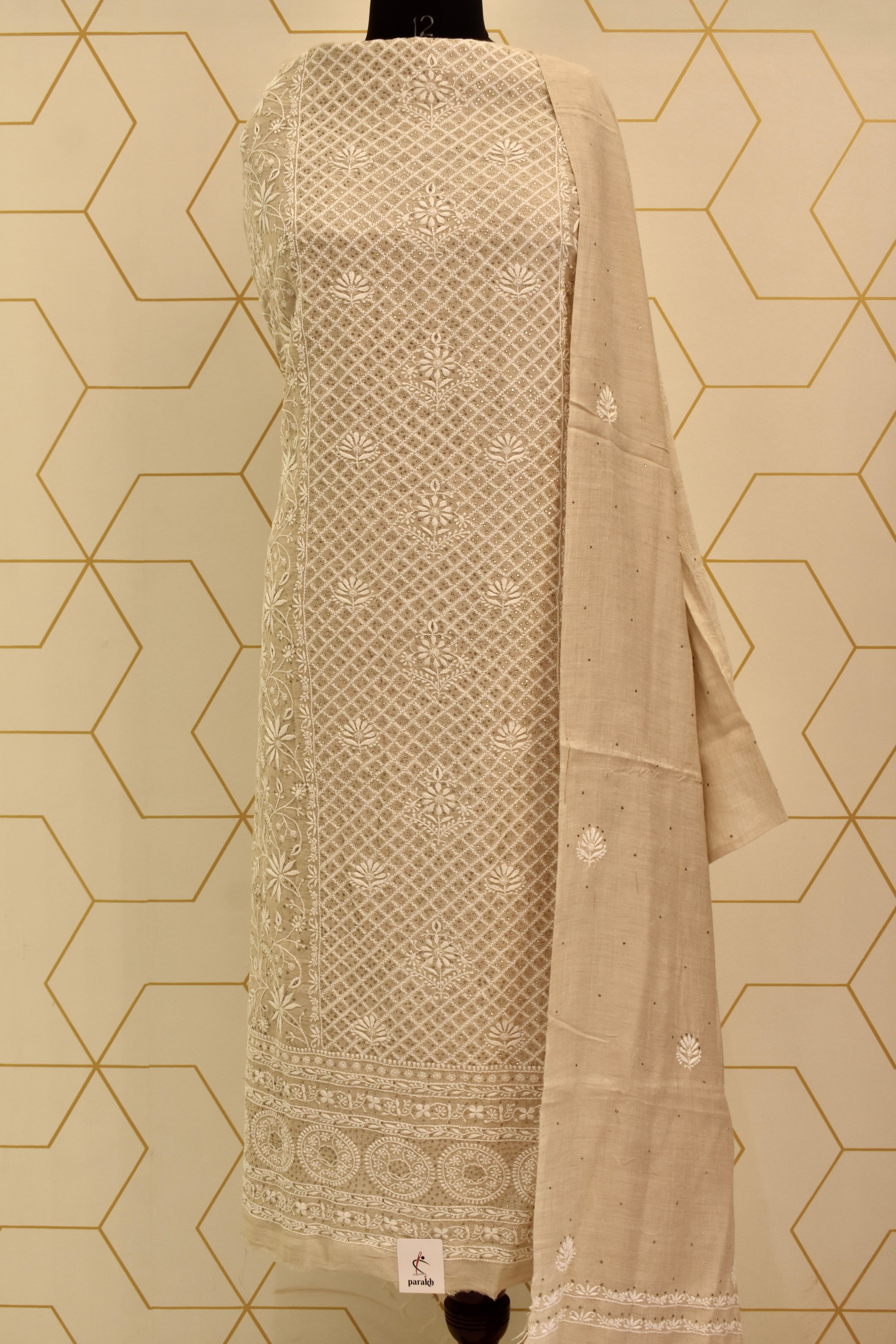 Embrace the beauty of Moonga Silk Chikankari Suit showcasing hand-embroidered chikankari work.