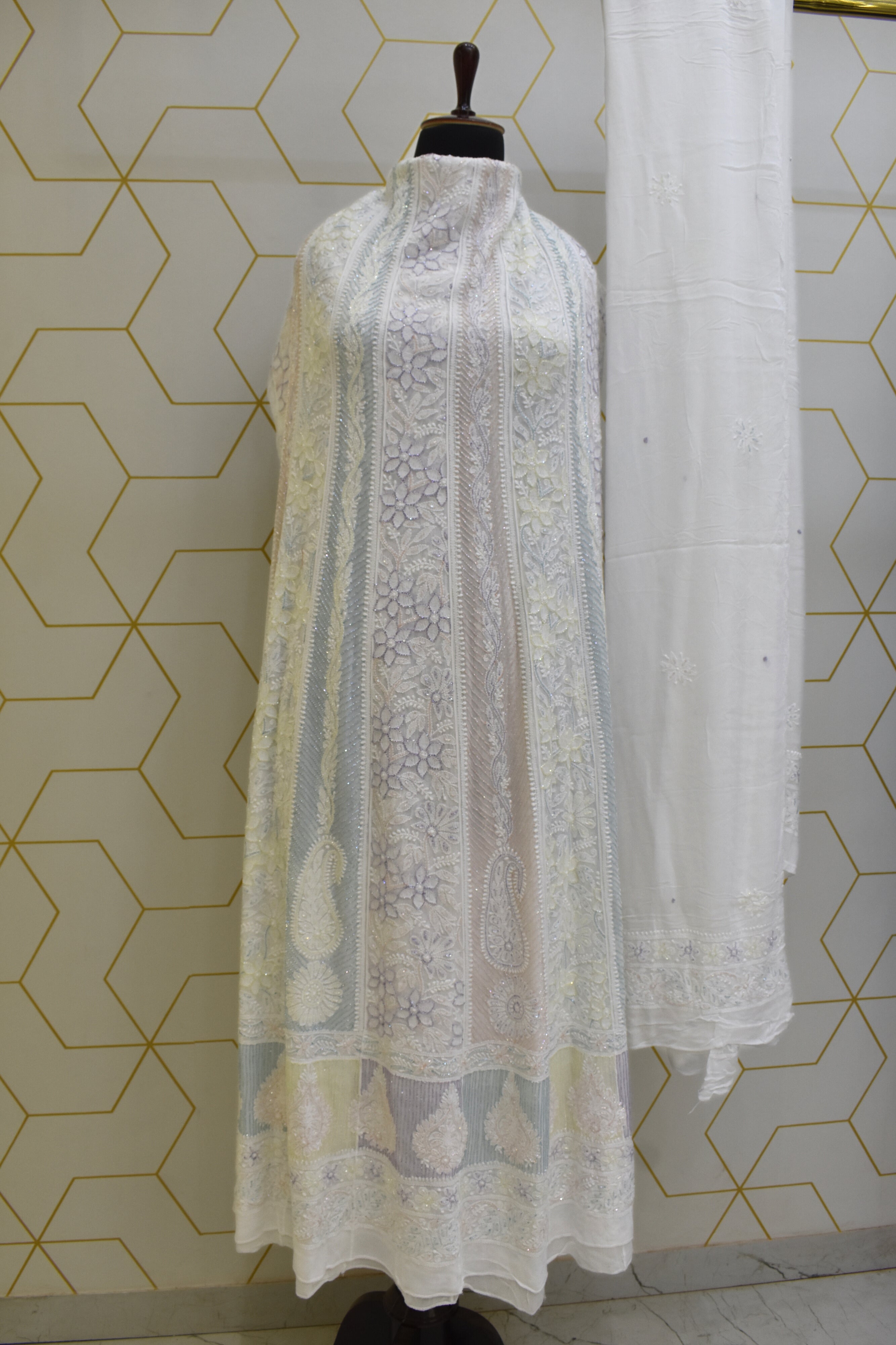 Please note that due to the handmade nature of our products, there might be slight variations in the crafting and embroidery compared to the showcased images. The visibility of threads on the back of the materials is a symbol of authentic handmade chikankari.